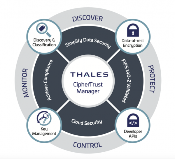Ranije poznato kao Next Generation KeySecure, ovo rješenje pruža granularnu kontrolu pristupa i konfigurirane sigurnosne politike. Upravlja životnim ciklusom svih ključeva, što uključuje generiranje, rotaciju, uništavanje te import i export ključeva. Platforma omogućuje postavljanje kontrole pristupa temeljem uloga te pristup izvješćima. Uz fleksibilne REST API-je i interoperabilnost s KMIP i PKCS 11, Thales CipherTrust je dostupan u fizičkoj i virtualnoj infrastrukturi. Platforma se može pokretati kroz Google Cloud, Microsoft Azure, AWS, VMware, Microsoft HyperV i druga rješenja.