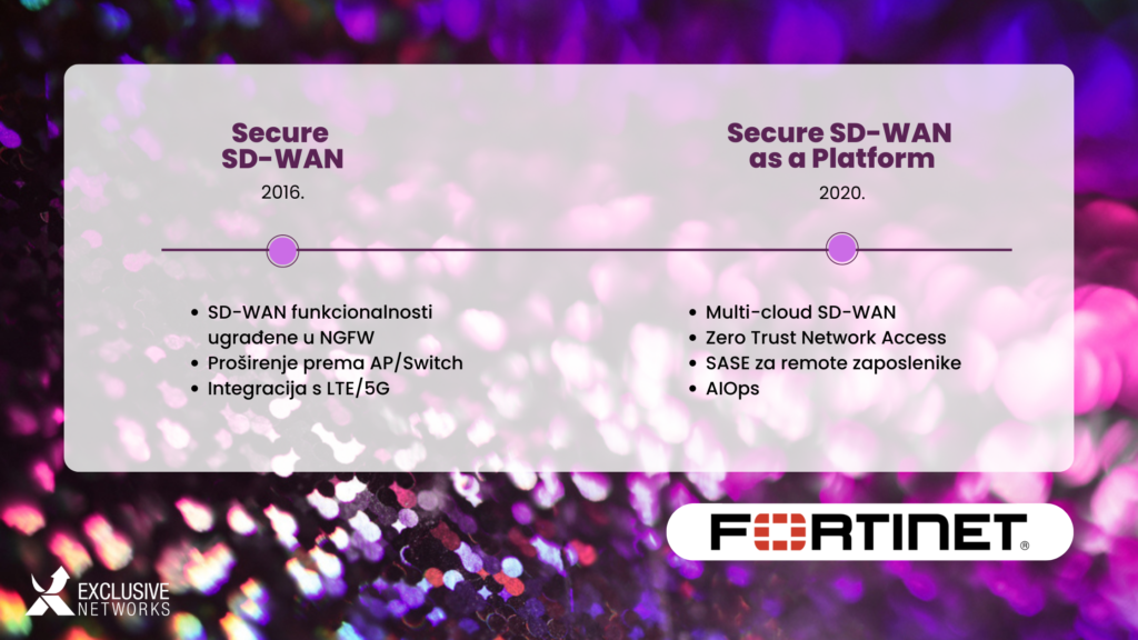 Postavljanje dodatnih sigurnosnih alata ne može garantirati zaštitu korisnika SaaS aplikacija ili osjetljivih podataka. Fortinet je to prepoznao i zaključio da se postizanje optimalnog korisničkog iskustva i sigurnosti može postići samo integracijom mrežnih funkcionalnosti sa sigurnosnim funkcijama. To znači integraciju sigurnosnih rješenja u mrežnu funkcionalnost SD-WAN-a. Konačno, Fortinet je dodao SD-WAN funkcionalnost svojoj NGFW platformi i uveo Secure SD-WAN, kombinujući ZTNA i SASE tehnologije sa inteligentnim upravljanjem.