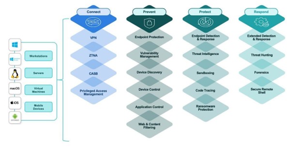 FortiEndpoint integrates key capabilities ZTNA, endpoint protection platform (EPP), endpoint detection and response (EDR), and extended detection and response (XDR) to deliver secure connectivity, advanced threat detection, and automated response into a single solution. This powerful, streamlined client gives IT and security teams enhanced visibility and control over their extended network environments.