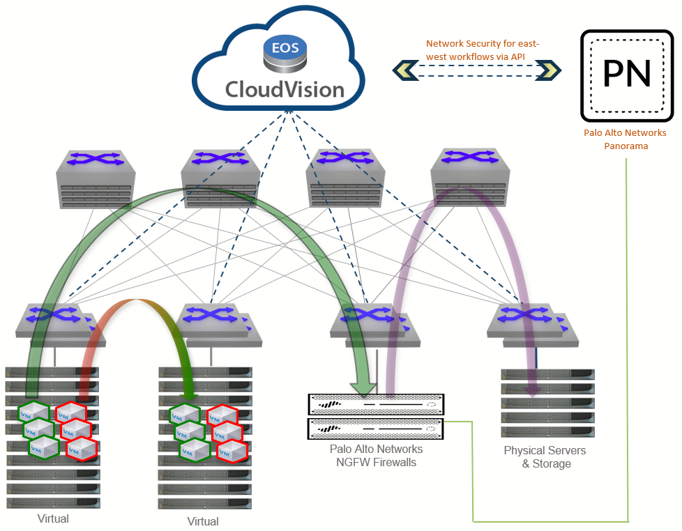 Durch die Integration mit nativen APIs, die von den führenden Next-Generation Firewalls von Palo Alto Networks im Rechenzentrum (PA-3200-Serie, PA-5200-Serie und PA-7000-Serie) bereitgestellt werden, und Panorama – nativen APIs, die bereits vorhanden sind – lernt Arista Macro-Segmentation die Sicherheitsrichtlinien und ermittelt die Workloads, die die Firewall benötigt, um den Datenverkehr zu überprüfen und Massnahmen zu ergreifen. Nach der Identifizierung kann MSS nun interessanten Datenverkehr zur Firewall lenken und so eine logische Topologie der Firewall im Pfad der Workload-Flows ermöglichen.