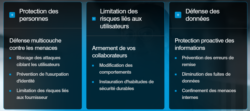 Après avoir identifié les trois risques humains les plus critiques pour la sécurité de votre entreprise — les menaces ciblant les utilisateurs, les fuites de données et les erreurs humaines — 3 solutions intégrées peuvent y faire face.