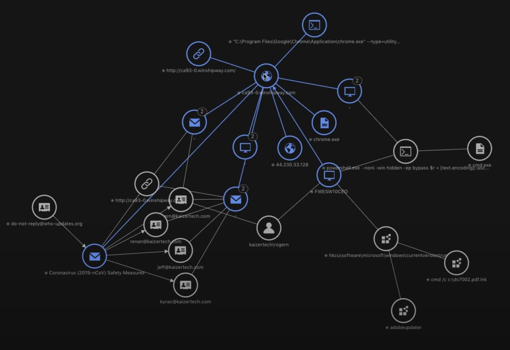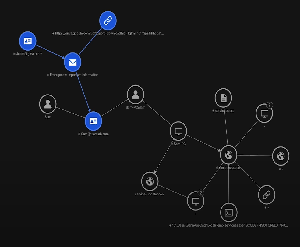 Obzirom na to da je uzbuna nešto što zahtijeva našu pažnju, klikom na istu moramo moći dobiti sve detekcije povezane u cjelinu koja daje operativnu svijest, kao na primjeru niže gdje je prikazan tipični deployment ransomware-a (klik za uvećati):