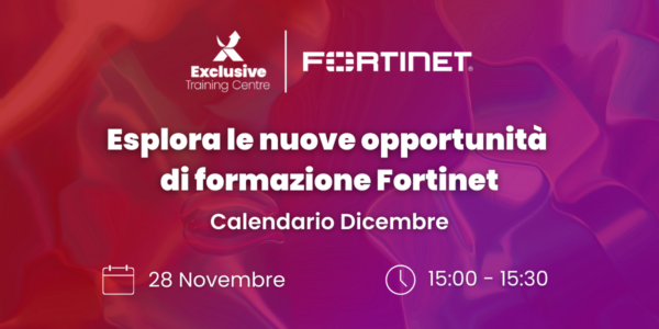 Siamo lieti di invitarti al nostro prossimo webinar “Esplora le nuove opportunità di formazione Fortinet: calendario Dicembre“, che si terrà il 28 Novembre alle ore 15:00, dedicato alla proposta formativa Fortinet per il mese di Dicembre.