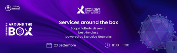 Il 23 Settembre, alle ore 11.00, ti aspettiamo al webinar “Services around the box” per presentarti i servizi best-in-class di Exclusive Networks dedicati a semplificare i processi di installazione e configurazione dei dispositivi.