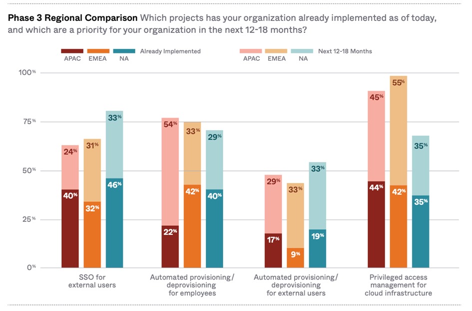 Organisaties in de APAC-regio investeren ook zwaar in het automatiseren van provisionerings- en deprovisioneringsprocessen voor werknemers, waarbij de adoptiepercentages naar verwachting zullen stijgen van 22% in 2021 tot 76% in 2022. De adoptiepercentages in EMEA blijven niet ver achter: 74% van de organisaties geeft aan de beveiligingspraktijk binnen de komende 18 maanden te zullen implementeren.