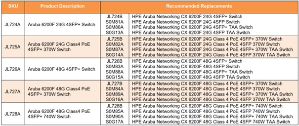 In de onderstaande tabel vindt u de Aruba 6200F-producten die worden vermeld als EoS vanwege de introductie van de B variant van de HPE Aruba Networking CX 6200F-productlijn. De A variant van de Aruba 6200F-producten zijn uitgebracht op 5 mei 2020 en hebben inmiddels enkele hardware-updates ondergaan. Hierdoor is inmiddels de B variant gelanceerd, deze B variant is volledig interoperabel met de A variant Aruba 6200F-producten.