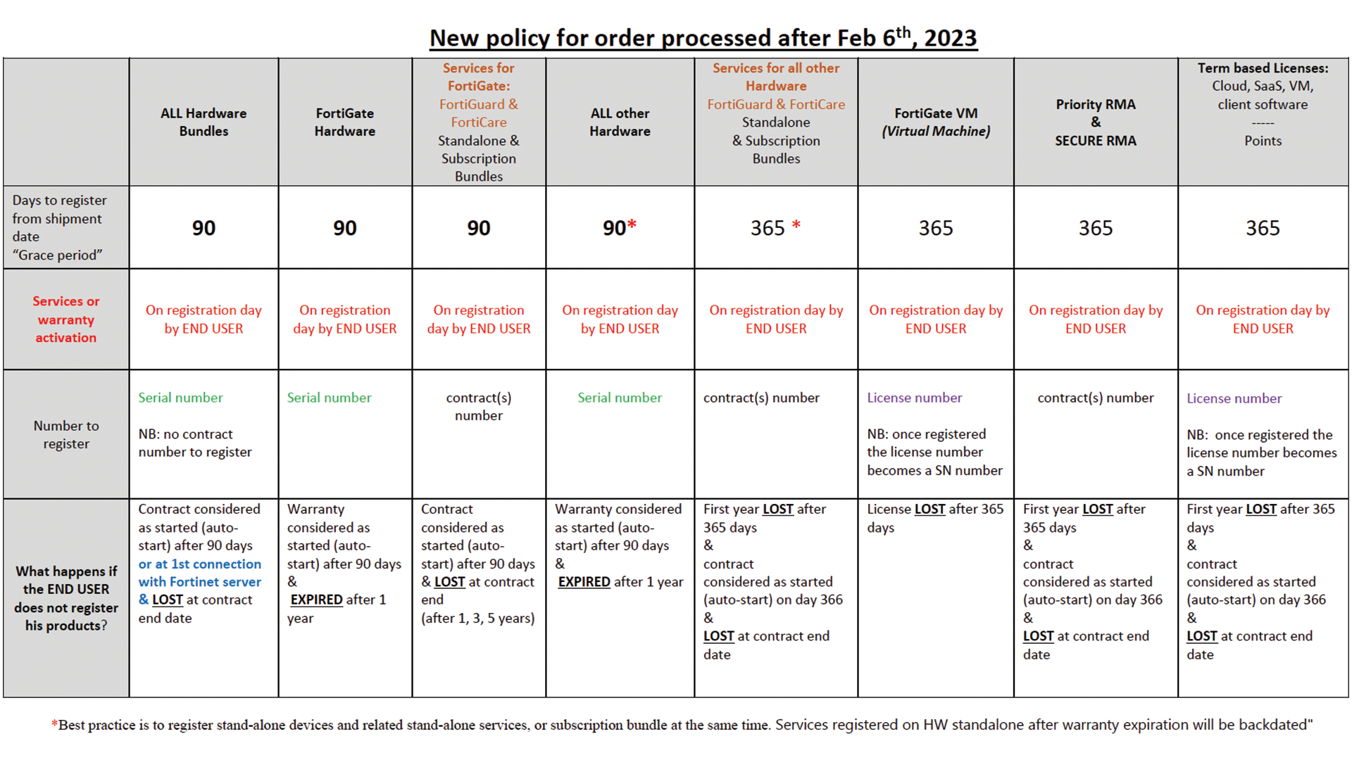 Bij aanschaf van nieuwe hardware of (losse) nieuwe services/licenties (niet voor verlengingen) dienen eindgebruikers of partners de nieuwe producten (HW en services) te registreren binnen de “grace period” in de eigen FortiCloud-account.