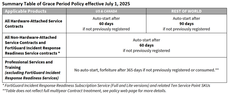 De periode waarbinnen producten geregistreerd moeten worden, de zogenaamde “grace periode”, start op de verzenddatum vanaf Fortinet Warehouse en bedraagt: