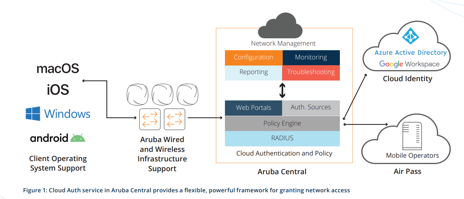 Cloud Autorisatie in Aruba Central geeft gebruikers de mogelijkheid om automatisch en veilig te verbinden met wired en wireless netwerken. De security service integreert met de bestaande Cloud identiteit zoals Google Workspac en Azure Active Directory om de gebruikers informatie te verifiëren en de juiste netwerk toegang te verlenen.