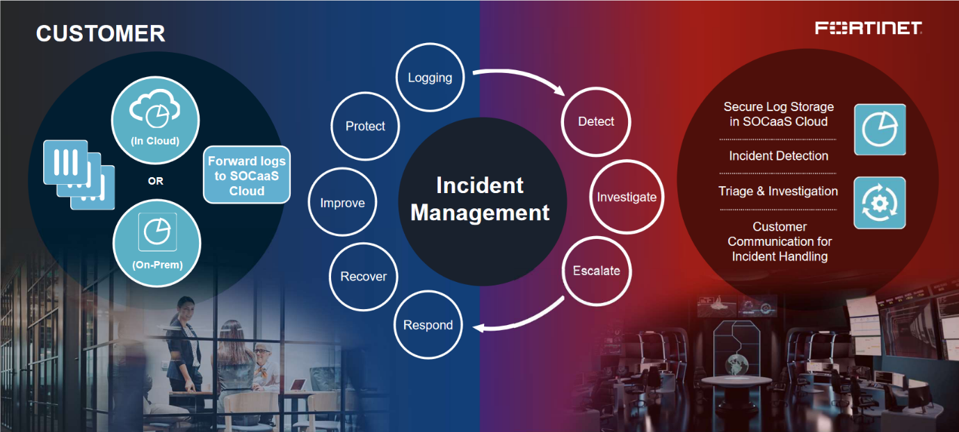 Fortinet zorgt voor de daadwerkelijke detectie, het onderzoek en de escalatie van de threat. Als partner kunnen jullie het eerste aanspraakpunt zijn en zo jullie dienstverlening richting de klant tonen door het daadwerkelijk reageren op de threat (eventueel recovery uitvoeren) en de omgeving van de klant verder verbeteren op basis van de door Fortinet aangeleverde informatie.