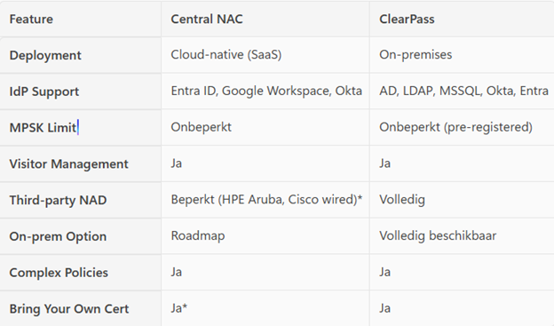 De afbeelding die je hebt gedeeld toont een vergelijking tussen Central NAC en ClearPass. Hier zijn de belangrijkste punten: