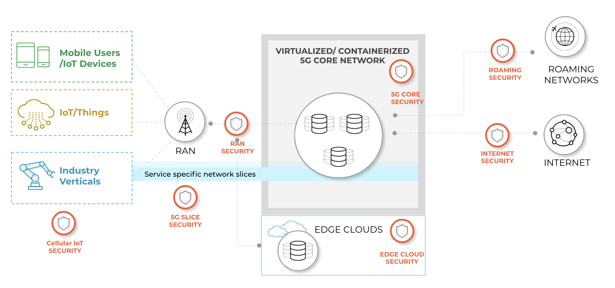 Elk 5G-beveiligingsplatform moet nu al het verkeer en netwerken beschermen en een veilige omgeving bieden voor zakelijke gebruikers en klanten van serviceproviders. Daarom is de benadering van 5G-beveiliging gebaseerd op: