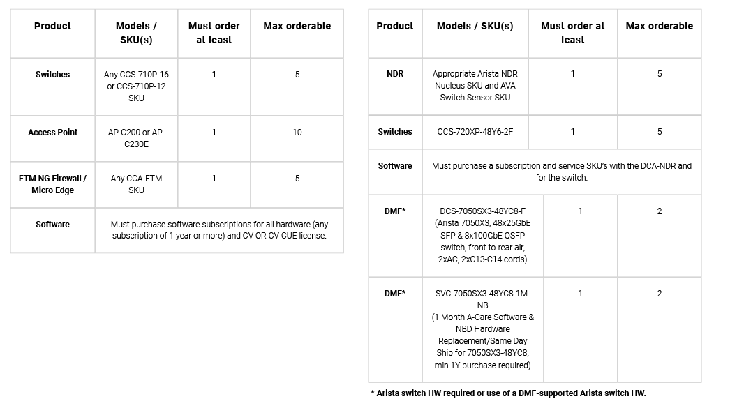 Arista biedt partners productbundels aan die gegarandeerd binnen 60 dagen of minder worden verzonden. U kunt kiezen uit drie geselecteerde bundels: Arista CUE-, DFX- en NDR AVA