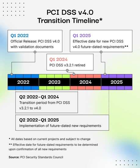 Versie 4.0 werd uitgebracht in het tweede kwartaal van 2022, maar de overgangsperiode van de huidige versie (v3.2.1) naar v4.0 duurt tot het eerste kwartaal van 2024. Toekomstige vereisten moeten voor het eerste kwartaal van 2025 worden geïmplementeerd om te voldoen aan versie 4.0.