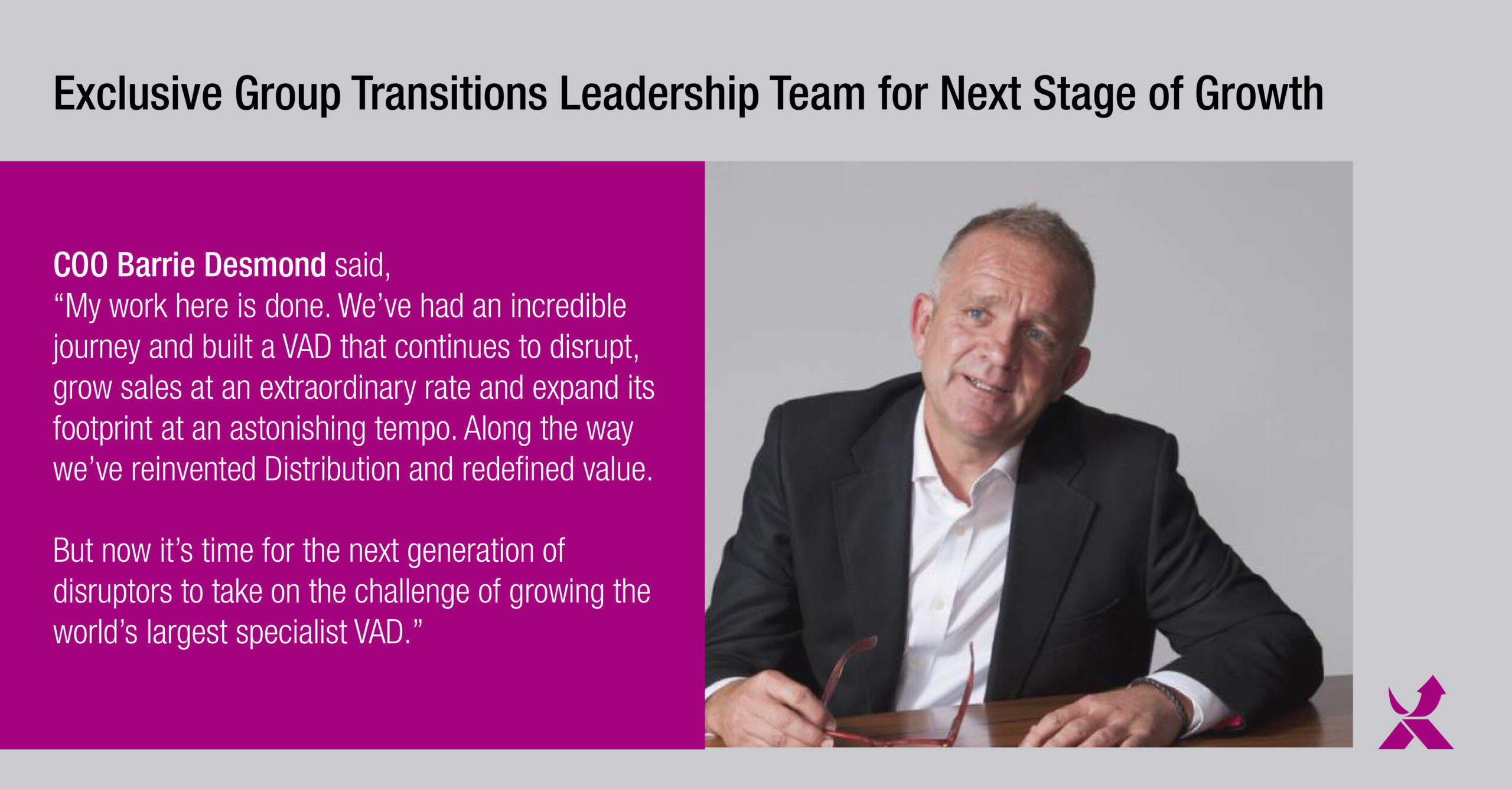 Commenting on his decision to leave Exclusive at the end of the year, COO Barrie Desmond said, “My work here is done. We’ve had an incredible journey and built a VAD that continues to disrupt, grow sales at an extraordinary rate and expand its footprint at an astonishing tempo. Along the way we’ve reinvented Distribution and redefined value. But now it’s time for the next generation of disruptors to take on the challenge of growing the world’s largest specialist VAD.”