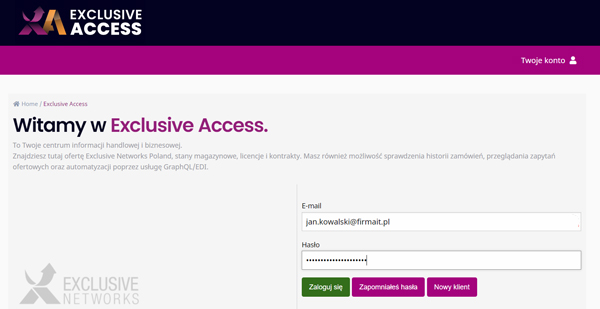 Zaloguj się na stronie Exclusive Access korzystając z otrzymanego wcześniej loginu i ustalonego samodzielnie hasła. Jeśli ich nie posiadasz, poproś o dostęp do systemu >>>
