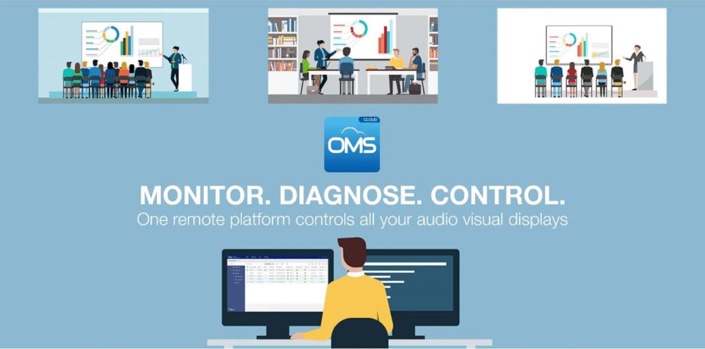 - Globalny spokój ducha – monitorowanie, diagnozowanie i kontrola wyświetlaczy audiowizualnych za pomocą konta OMS Cloud z dowolnego urządzenia na jednej platformie w dowolnym miejscu, co eliminuje potrzebę fizycznego odwiedzania miejsca instalacji.