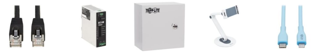 - przemysł: UPS i ATS PDU, zasilanie PoE, listwy zasilające i zabezpieczenia przeciwprzepięciowe, stacje i wózki do ładowania, kable i przełączniki Ethernet, serwery konsoli, USB, AV, szafy NEMA 12 (IP54), systemy i uchwyty montażowe.