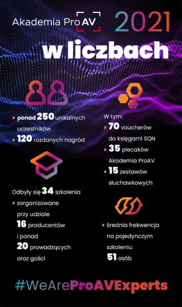 Inicjatywa Akademia ProAV 2021 zakończona sukcesem! Celem programu było zmotywowanie do zdobywania wiedzy podczas szkoleń online z zakresu profesjonalnych technologii AV (audiowizualnych) oraz do komunikacji zdalnej (Unified Communications).
