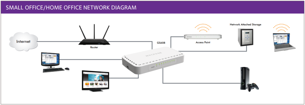 GS608 to bardzo dobra opcja do zastosowania przede wszystkim w małych biurach lub w domu – przykładowa sieć może wtedy wyglądać tak: