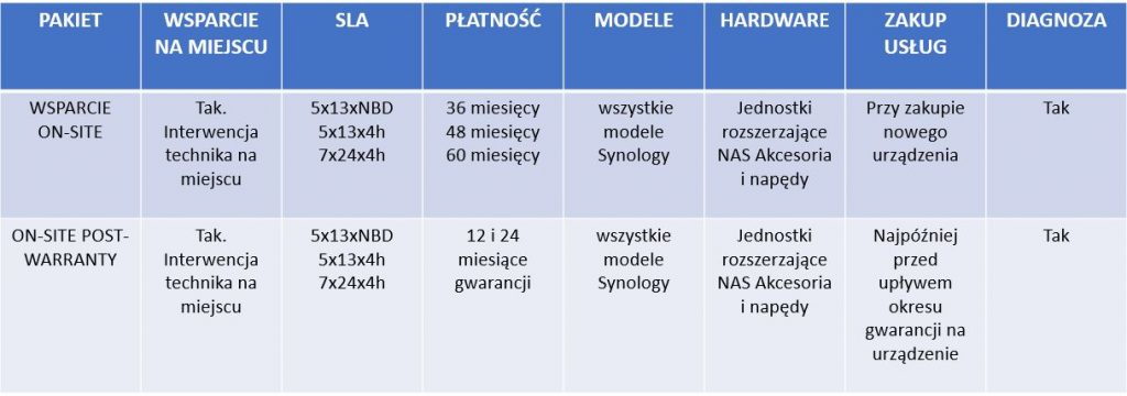 Pakiety usług autoryzowanego wsparcia technicznego firmy Synology są oferowane w kilku wariantach:
