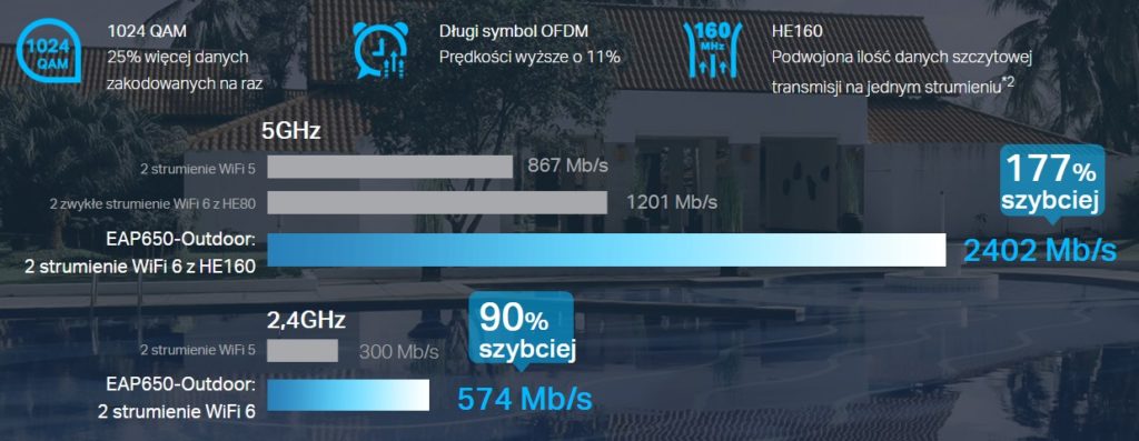 Nowe technologie standardu 802.11ax (modulacja 1024QAM, długi symbol OFDM) oraz zastosowanie kanałów 160Mhz HE160 umożliwiają urządzeniu osiąganie najwyższej wydajności i bardzo wysokich prędkości (do 574 Mb/s w paśmie 2,4 GHz oraz 2402 Mb/s w paśmie 5 GHz):