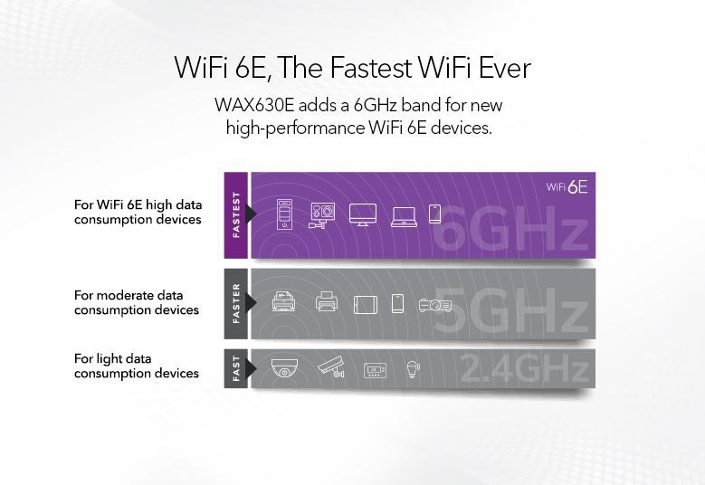 Wi-Fi 6E to ewolucja Wi-Fi 6, która polega na dodaniu zupełnie nowego pasma: Wi-Fi 6 GHz – superszybkiej „autostrady” dla wysokowydajnych urządzeń. Efekty? Najwyższa prędkość i największa pojemność w historii, nawet u najbardziej wymagających użytkowników i w znacznie bardziej zatłoczonych środowiskach! Przyjrzyjmy się więc nowym możliwościom dla sieci bezprzewodowych, które stały się teraz osiągalne dzięki rozwiązaniom wspierającym Wi-Fi 6 GHz już dostępnym na rynku (na przykładzie punktu dostępowego WAX630E od NETGEAR).