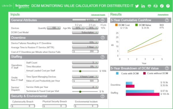 Nowe narzędzie TradeOff od Schneider Electric („DCIM Monitoring Value Calculator for Distributed IT”) uzupełnia od strony praktycznej powyższy zestaw wytycznych i umożliwia obliczanie potencjalnej wartości i zwrotu z inwestycji w oprogramowanie do monitorowania oraz zarządzania infrastrukturą IT centrum danych: