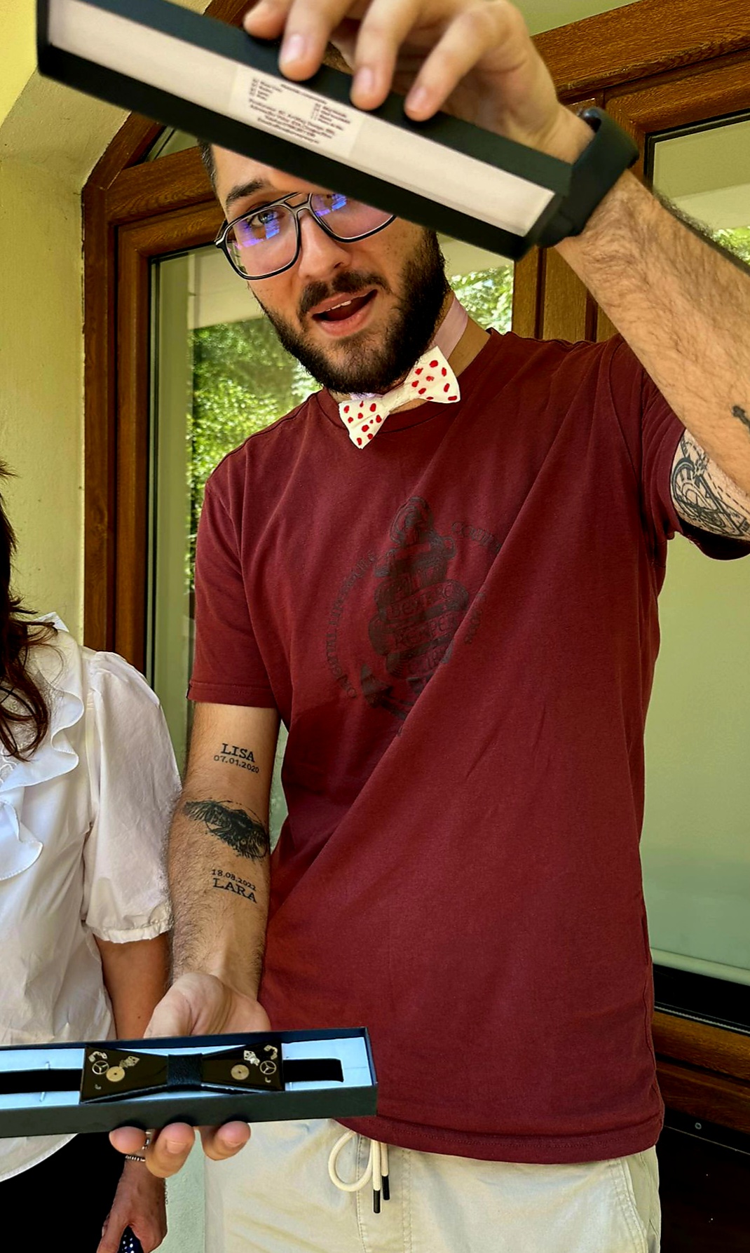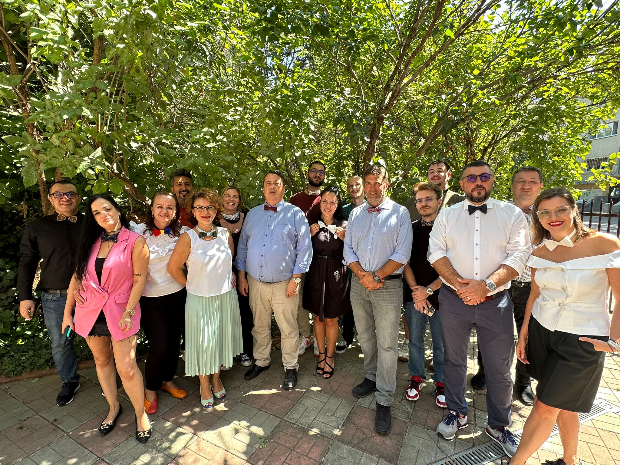 Papionul Irinei care a calatorit 39 de ani, al lui Robert realizat din lemn, papioane facute ad-hoc, dar cu creativitate si indemanare din servetele, papionul Alinei– un mic drapel, purtat de copiii ei la scoala, papion din pene, sau un papion demn unui adevarat Grinch al papioanelor, reinventat dintr-o bandana din echipamentul moto 😊, sau pur si simplu papioane de imprumut pentru cei care au venit «impacati cu soarta» ieri de dimineata ca nu au papion, dar au intrat in hora, pana la urma, si a iesit…ce a iesit 😊.