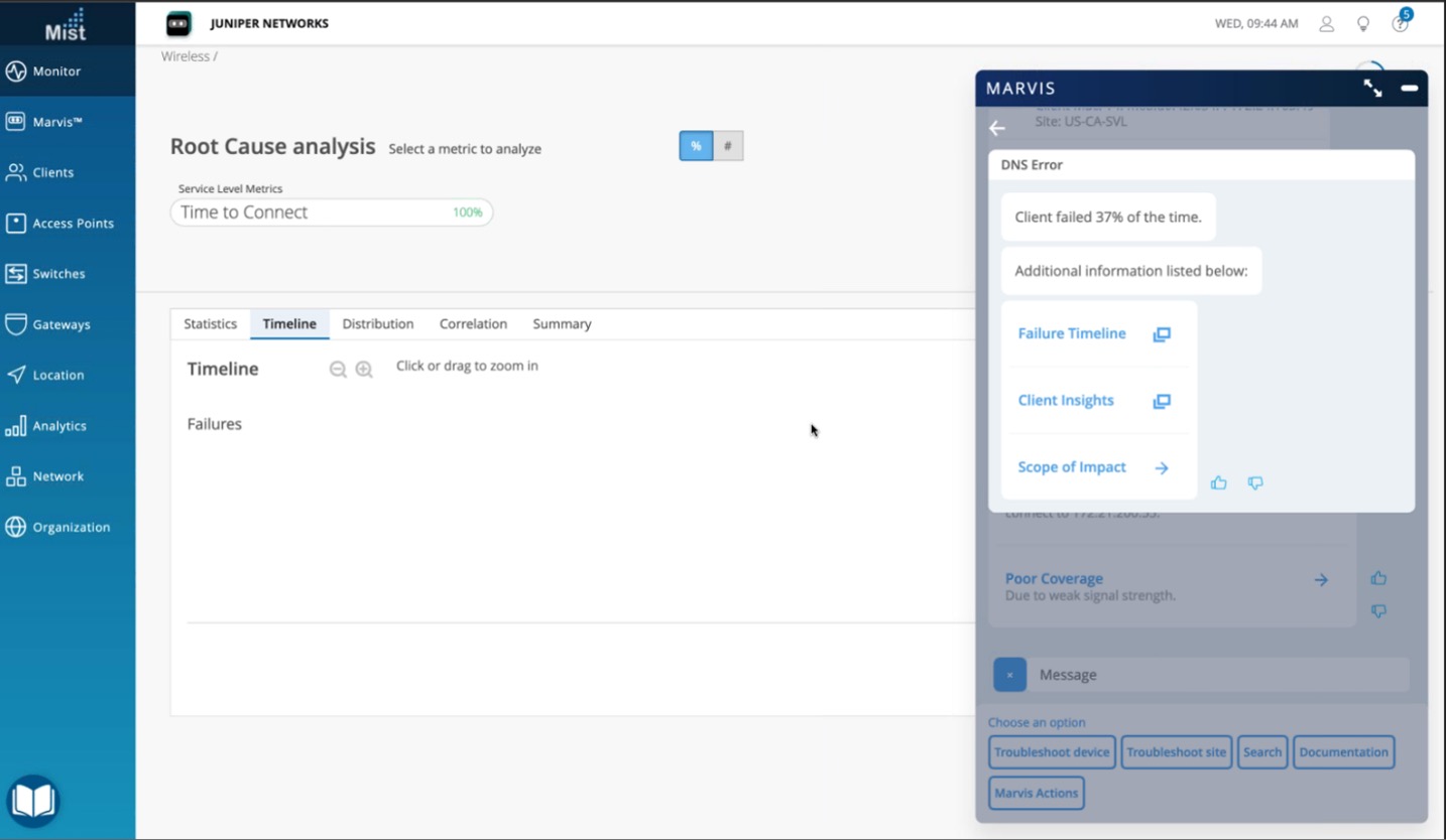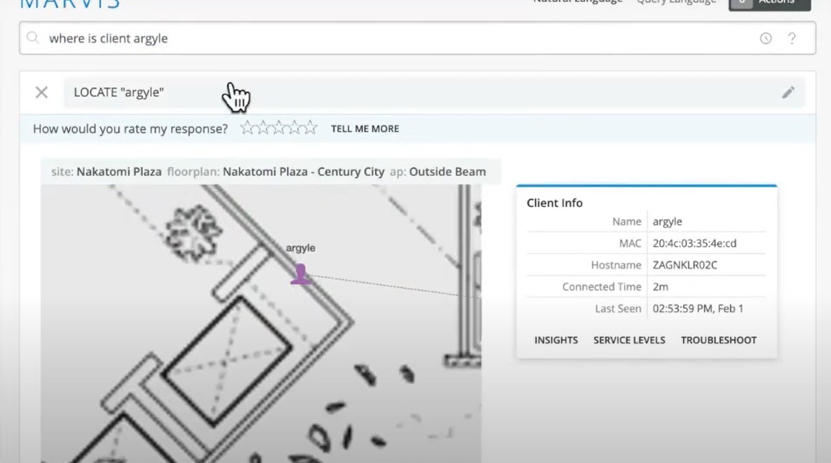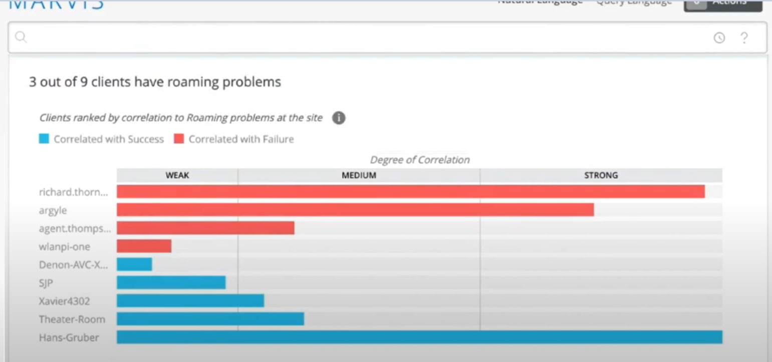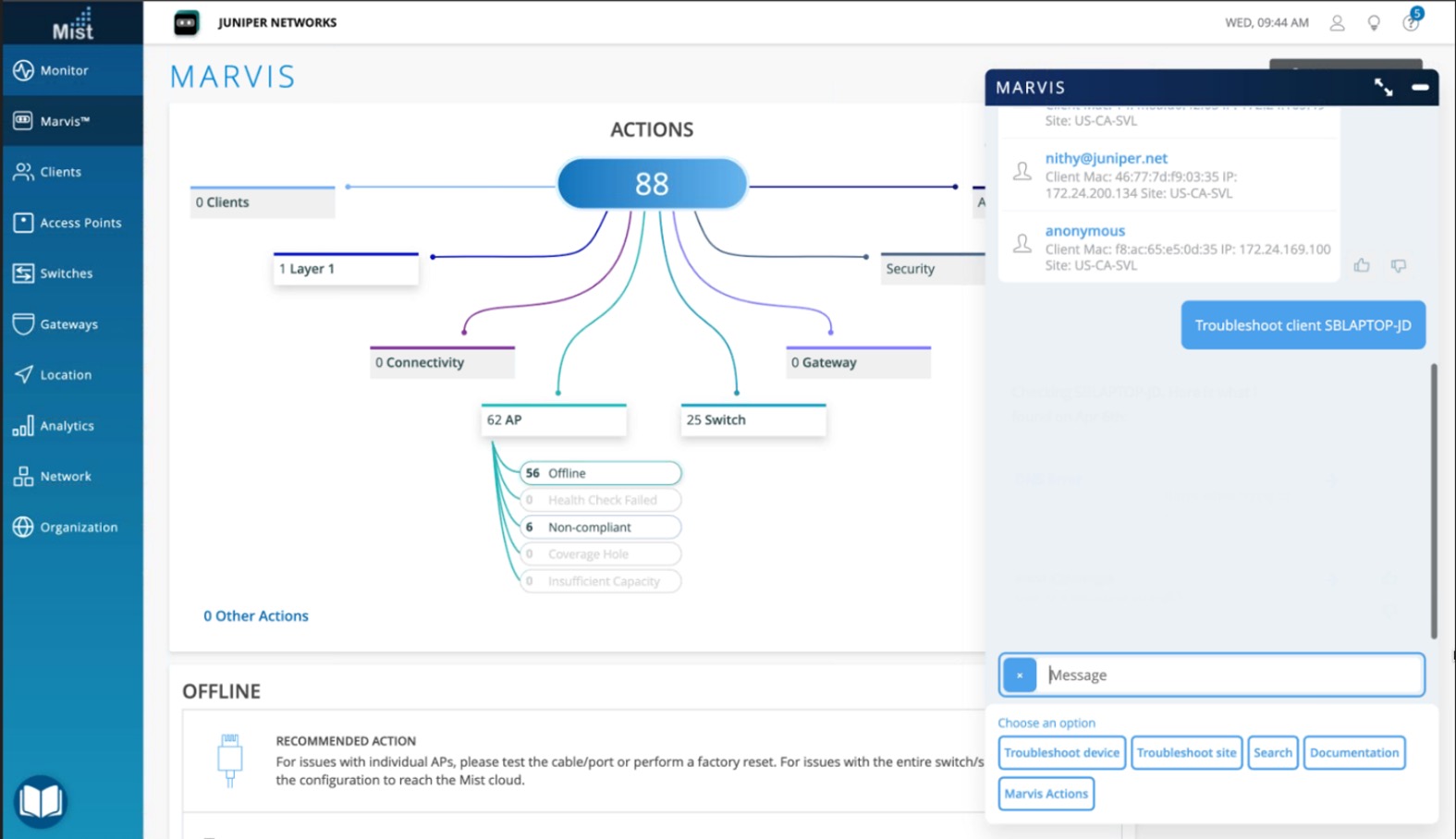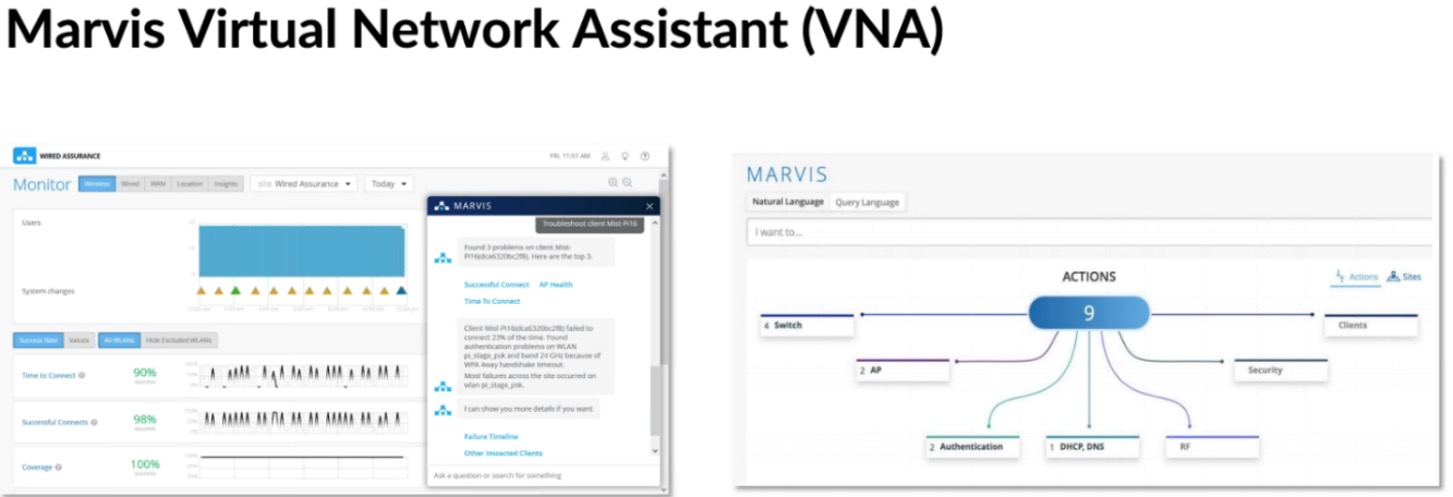 Parte integranta a solutiei, Marvis este primul VNA din industrie (Virtual Networks Assistant sau in traducere libera Expertul virtual bazat pe inteligenta artificiala) care asista in administrarea retelei, oferind atat informatii relevante despre functionarea ei cat si solutii pentru optimizare, totul prin intermediul interfetei conversationale in limbaj natural. Desi poate fi considerat limbaj de lemn acest “limbaj natural”, dar, odata ce consideram ca exista o diferenta intre modul de comunicare uman si cel prin care executam comanda si controlul sistemelor informatice, intelegem ca reprezinta o traducere decenta a ceea ce Marvis incearca sa realizeze prin imbunatatirea uneltelor sale dedicate (NLP, NLU si NLG – Natural Language Processing / Understanding / Generation). Se ajunge pana la interpretarea cererii in context, cu posibilitatea rafinarii dialogului in vederea obtinerii mai rapide a raspunsurilor, accelerarii fluxului de depanare si optimizare, inclusiv definirea unor raspunsuri automate…