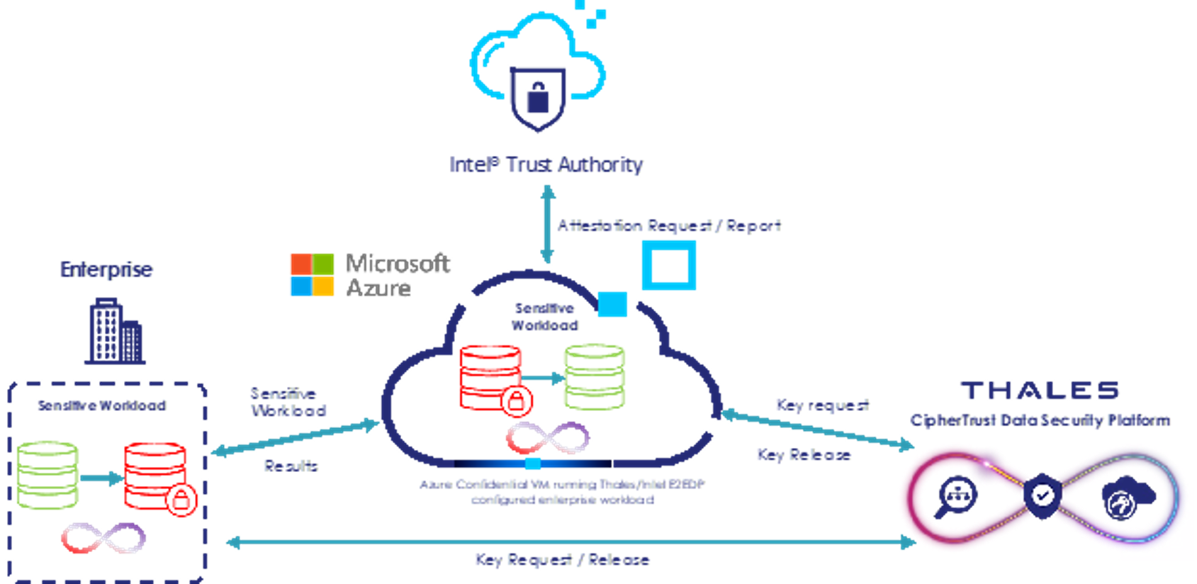 Ca raspuns la aceasta provocare, colaborarile din industrie care implica producatori de cipuri, furnizori de servicii cloud si furnizori de software/hardware contureaza un ecosistem avansat de incredere pentru protectia datelor end-to-end prin calcul confidential. Thales, Intel si Microsoft isi unesc fortele pentru a oferi o solutie cuprinzatoare pentru clientii Microsoft Azure. Aceasta colaborare foloseste tehnologiile de calcul confidentiale, salvand datele utilizate prin executarea calculelor intr-un mediu de executie de incredere (TEE) izolat criptografic, furnizat de Intel.