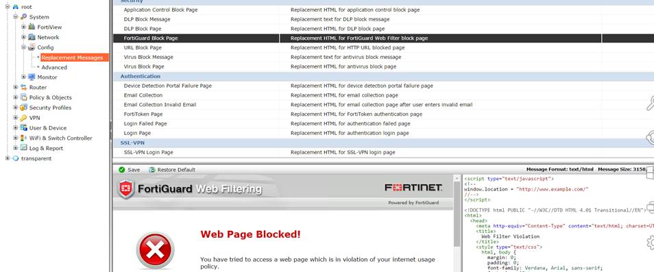 Pentru a face acest lucru se acceseaza pe Fortigate meniul Config -> Replacement Messages -> FortiGuard Block Page, iar in partea dreapta se insereaza scriptul de mai sus deasupra tuturor comenzilor HTML. Se salveaza noua configuratie ET VOILA!