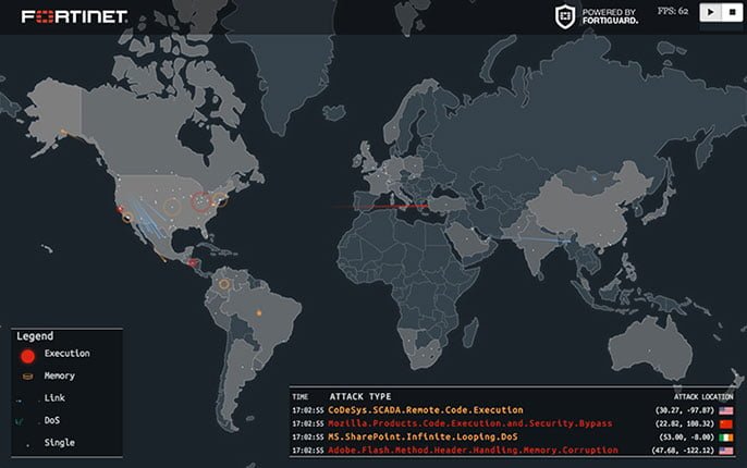 Click pentru a vedea harta interactiva: https://threatmap.fortiguard.com/