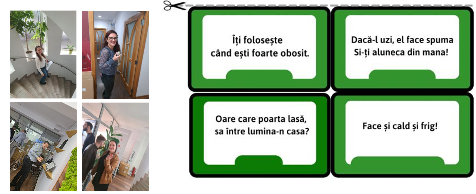 4 ghicitori indrumatoare ne-au ghidat colegii pe holuri, birouri, dulapuri, iar pe holuri si birouri, scari, chiar si pe terasa. Doar trebuia sa fie interactiv si ametitor. 😊