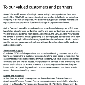 Extreme Agile Data Center solutions are optimized to enable Enterprise and Cloud organizations to achieve greater operational agility and efficiency that is critical for maintaining competitive advantage in this era of Digital Transformation and Cloud. Extreme’s pervasive network visibility and cross-domain network lifecycle automation intelligently automates provisioning, troubleshooting, and remediation of network infrastructure to eliminate network and cross-function service delays. Meanwhile, Extreme adaptive ASIC platforms deliver continuous value today and for years to come. Extreme’s Agile Data Center solutions enable organizations to break from the status quo and build stronger relationships with customers and partners to deliver better business outcomes.