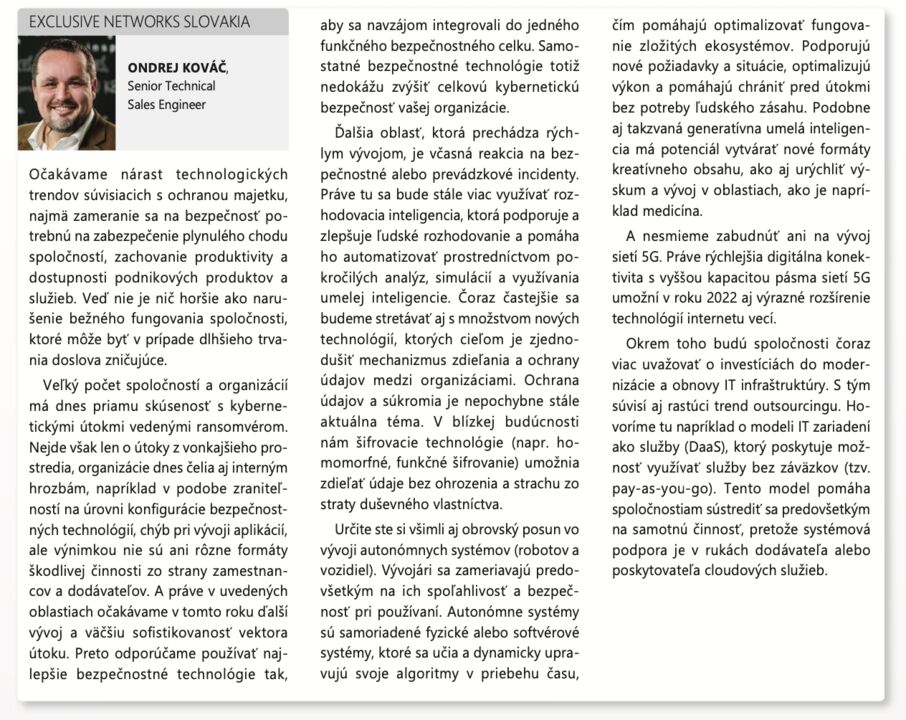 Veď nie je nič horšie ako narušenie bežného fungovania spoločnosti, ktoré môže byť v prípade dlh-šieho trvania doslova zničujúce. Veľký počet spoločností a organizácií má dnes priamu skúsenosť s kybernetickými útokmi vedenými ransomvérom. Nejde však len o útoky z vonkajšieho prostredia, organizácie dnes čelia aj interným hrozbám, napríklad v podobe zraniteľností na úrovni konfigurácie bezpečnostných technológií, chýb pri vývoji aplikácií, ale výnimkou nie sú ani rôzne formáty škodlivej činnosti zo strany zamestnancov a dodávateľov. A práve v uvedených oblastiach očakávame v tomto roku ďalší vývoj a väčšiu sofistikovanosť vektora útoku.