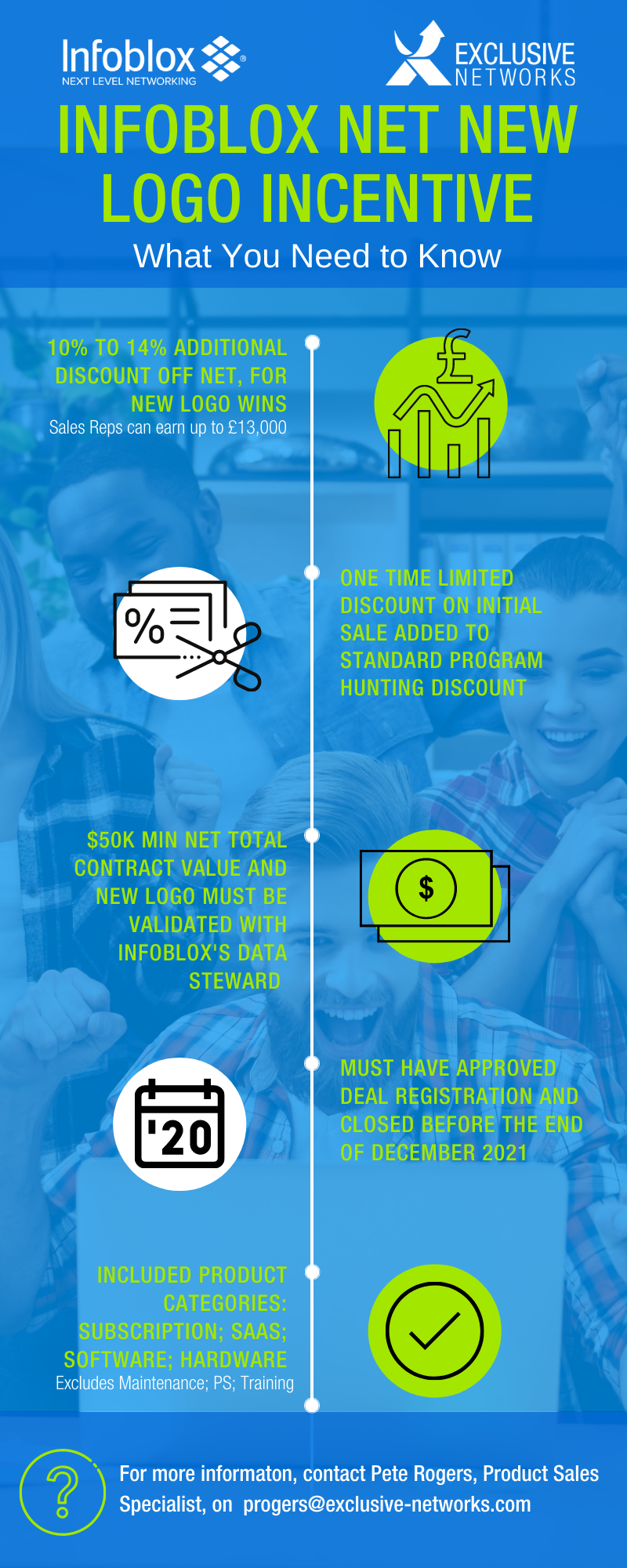 The Infoblox Net New Logo Incentive is designed to reward partners on new customer wins approved through Infoblox’s deal registration program, which compliments the existing SPIFF for individual salespeople.