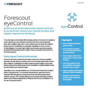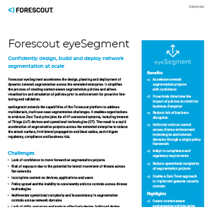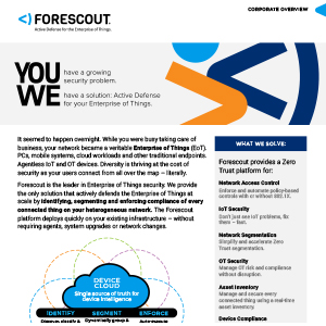 Forescout Technologies, Inc. delivers automated cybersecurity across the digital terrain, maintaining continuous alignment of customers’ security frameworks with their digital realities, including all asset types – IT, OT, IoT, IoMT. The Forescout Continuum Platform provides complete asset visibility, continuous compliance, network segmentation and a strong foundation for Zero Trust. For more than 20 years, Fortune 100 organizations and government agencies have trusted Forescout to provide automated cybersecurity at scale. Forescout arms customers with data-powered intelligence to accurately detect risks and quickly remediate cyber threats without disruption of critical business assets