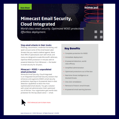 Since 2003, Mimecast has stopped bad things from happening to good organisations by enabling them to work protected. Mimecast empower more than 40,000 customers to help mitigate risk and manage complexities across a threat landscape driven by malicious cyberattacks, human error, and technology fallibility. Mimecast advanced solutions provide the proactive threat detection, brand protection, awareness training, and data retention capabilities that evolving workplaces need today. Mimecast solutions are designed to transform email and collaboration security into the eyes and ears of organisations worldwide.
